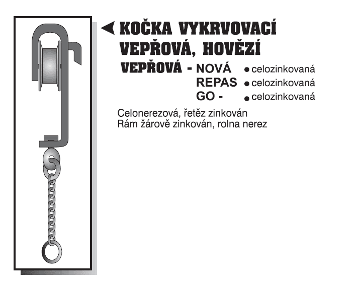 Vykvovací kočka slouží k zavěšení prasete při porážce. Skládá se z tělo z ploché ocele, řetěz s okem, ocelová kladka s kuličkovým ložiskem.